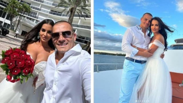 Брюнетката, която дълги години работеше в екипа на шоуто на Дългия, е емигрирала тихомълком в САЩ още миналата есен. Преди месец обяви във фейсбук, че се е сгодила за мистериозен господин, а малко след това отново хвърли в туш приятелите си със снимки от сватбата им. Фаталната хубавица се е венчала на плаж в Маями с новия си избраник. „И просто ей така… решихме да се оженим“, написа Аделина към младоженската им фотосесия. На снимките се вижда, че тя е облечена с красива бяла рокля с широко отворено деколте, което демонстрира пищната й гръд. На главата си има було, а букетът е класика – от червени рози с малки перли по тях. Младоженецът пък е заложил на бяла риза, светло син панталон и колан на скъпа модна марка, който демонстрира финансовото му благополучие. Двамата позират на яхта, до бяла лимузина и пред внушителен хотел. На кадрите се вижда и 9-годишната дъщеря на Аделина от връзката й с Борис Солтарийски. Малката Ема е заминала за Америка заедно с майка си и учи там от миналата година насам. Допреди това тя бе възпитаничка на Италианския лицей в Горна баня и родителите й редовно бяха засичани да я водят до престижното школо.